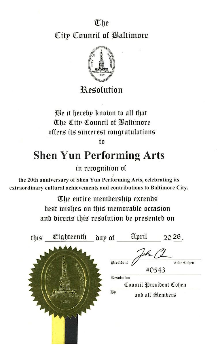 (Minghui.org) With Shen Yun Performing Arts scheduled to grace the stage of the Hippodrome Theatre from April 18 to April 19, 2026, the City Council of Baltimore passed a resolution recognizing Shen Yun’s “Extraordinary cultural achievements and contributions to Baltimore City.”