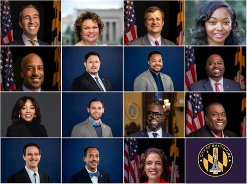 (Left to right, 1st to 4th row) Baltimore City Council President Zeke Cohen; Vice President Sharon Green; City Council Members Mark Parker, Danielle McCray, Mark Conway, Isaac “Yitzy” Schleifer, James Torrence, Paris Gray, Phylicia Porter, Zac Blanchard, Jermaine Jones, Antonio Glover, Ryan Dorsey, John T. Bullock, and Odette Ramos