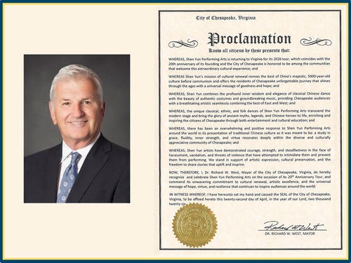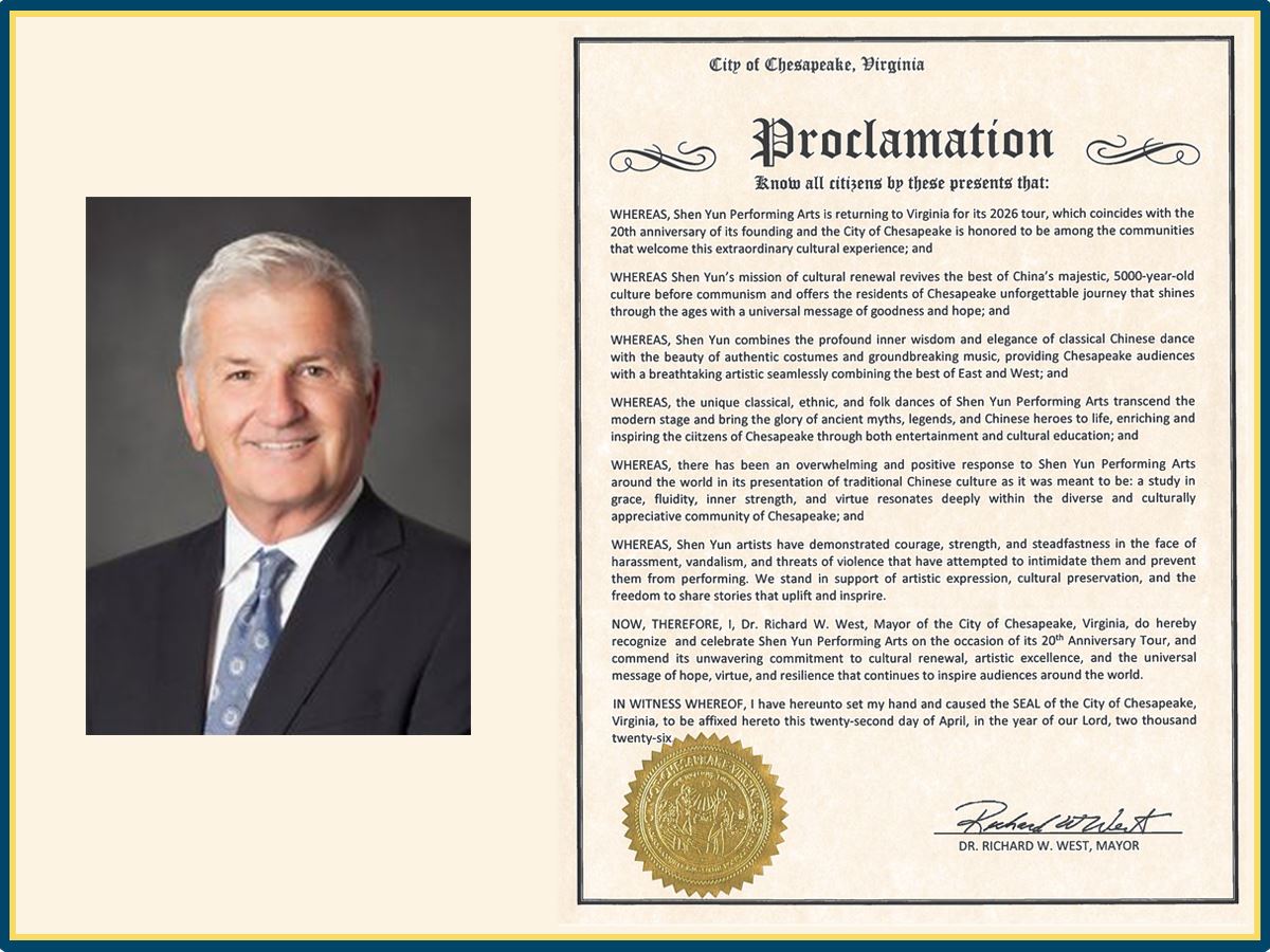 “NOW, THEREFORE, I, Dr. Richard W. West, Mayor of the City of Chesapeake, Virginia, do hereby recognize and celebrate Shen Yun Performing Arts on the occasion of its 20th Anniversary Tour, and commend its unwavering commitment to cultural renewal, artistic excellence, and the universal message of hope, virtue, and resilience that continues to inspire audiences around the world.”