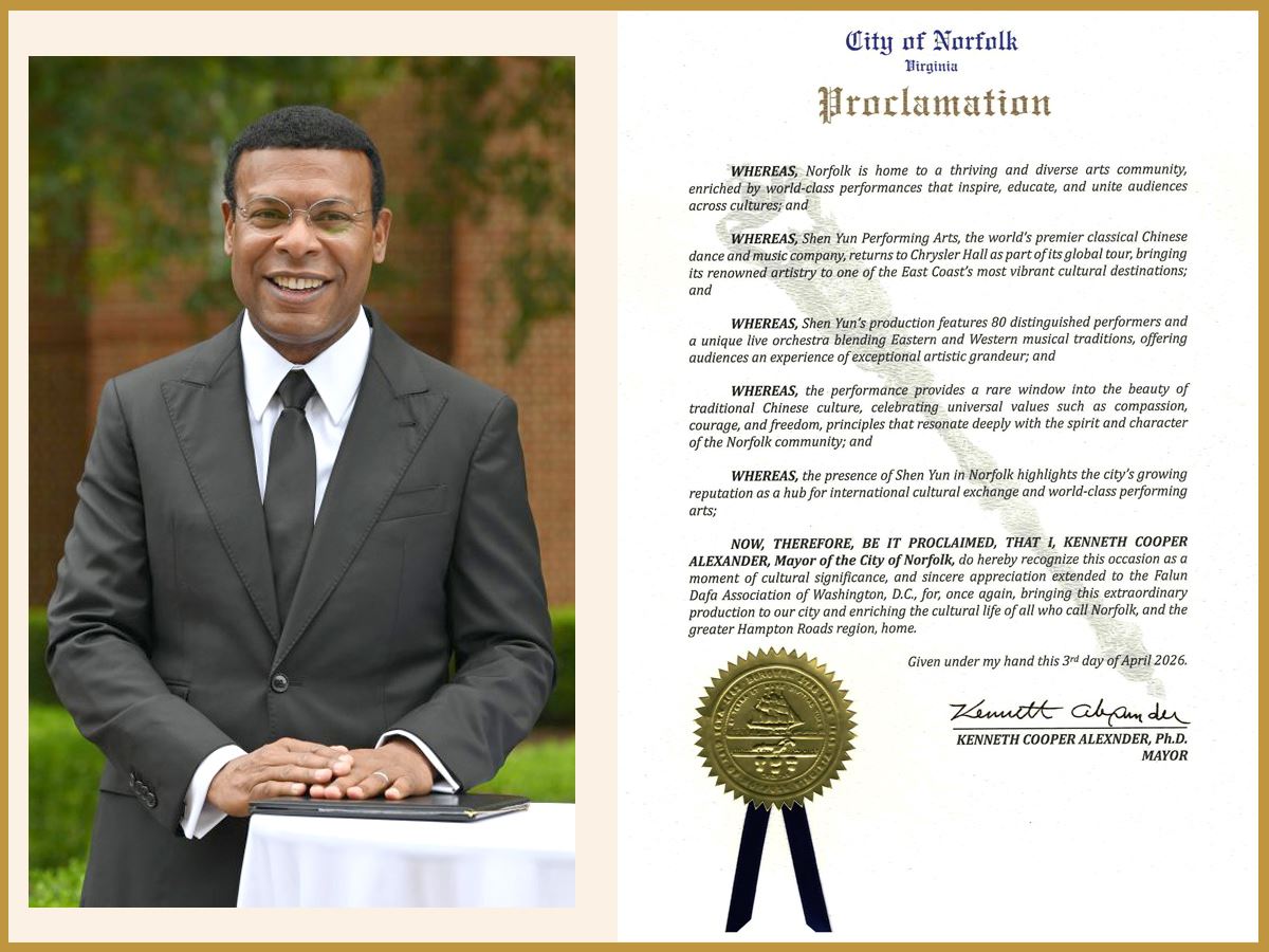 “NOW, THEREFORE, BE IT PROCLAIMED, THAT I, KENNETH COOPER ALEXANDER, Mayor of the City of Norfolk, do hereby recognize this occasion as a moment of cultural significance, and sincere appreciation extended to the Falun Dafa Association of Washington, D.C., for, once again, bringing this extraordinary production to our city and enriching the cultural life of all who call Norfolk, and the greater Hampton Roads region, home.”