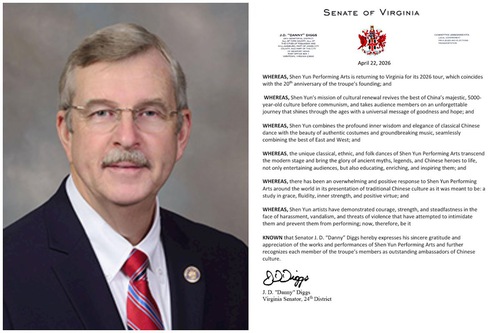 “KNOWN that Senator J. D. ‘Danny’ Diggs hereby expresses his sincere gratitude and appreciation of the works and performances of Shen Yun Performing Arts and further recognizes each member of the troupe’s members as outstanding ambassadors of Chinese culture.”