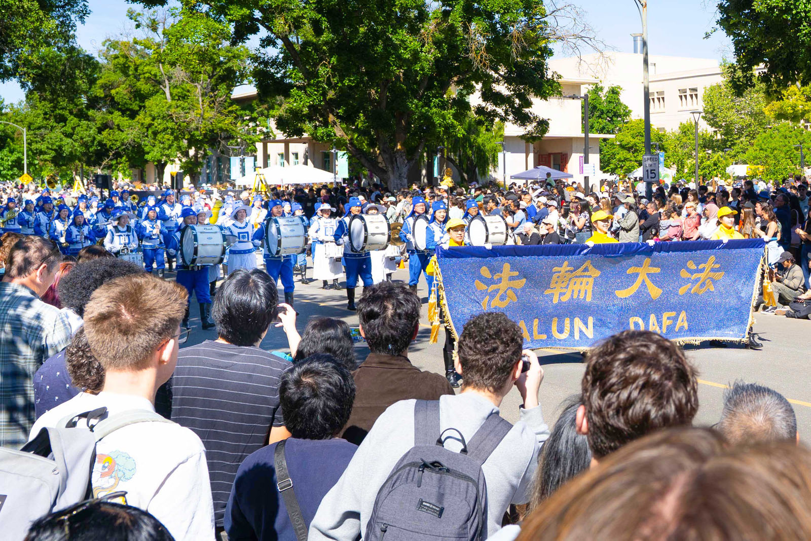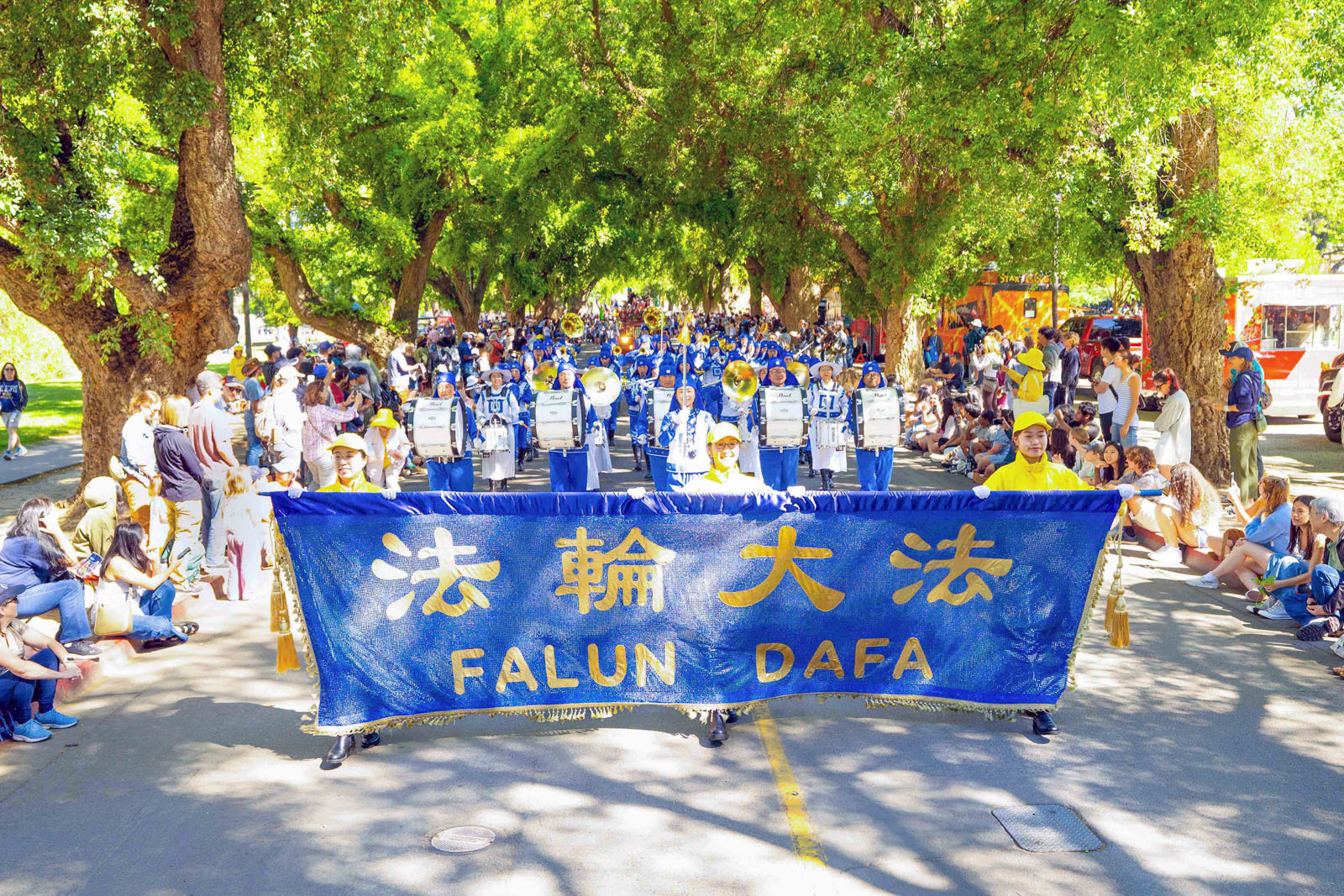 As the Tian Guo Marching Band passed the stage, the host introduced them and explained that the band members practice Falun Dafa, a cultivation practice that is guided by the principles of Truthfulness-Compassion-Forbearance.