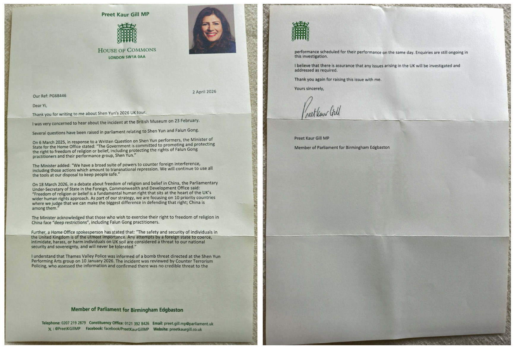The UK Falun Dafa Association received letters from Feryal Clark MP, Preet Kaur Gill MP, Jo Platt MP, Patricia Ferguson MP, Cameron Thomas MP, and Mark Pritchard MP, expressing their concern about the issue and saying that any attempt on the part of a foreign government to harass, intimidate, or harm individuals or groups in the UK will not be tolerated.