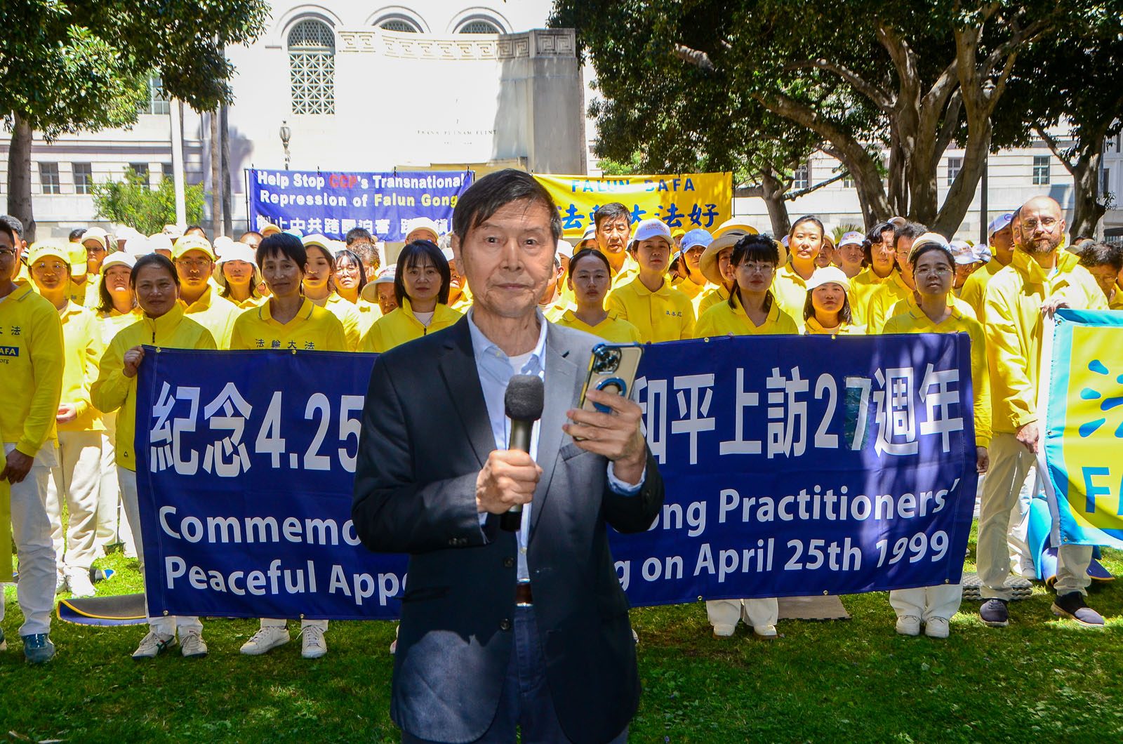 Professor Wu Yingnian, spokesperson for the Los Angeles Falun Dafa Association, briefly introduced the background of the April 25 appeal in Beijing. He said that practitioners went to Beijing to request the release of more than 40 practitioners who were arrested in Tianjian, a city 60 miles east of Beijing.