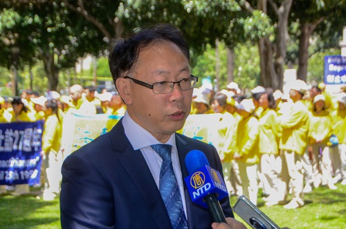 Dr. Li Youfu, director of the Southwest Falun Dafa Association, addresses the rally. (Screenshot courtesy The Epoch Times)