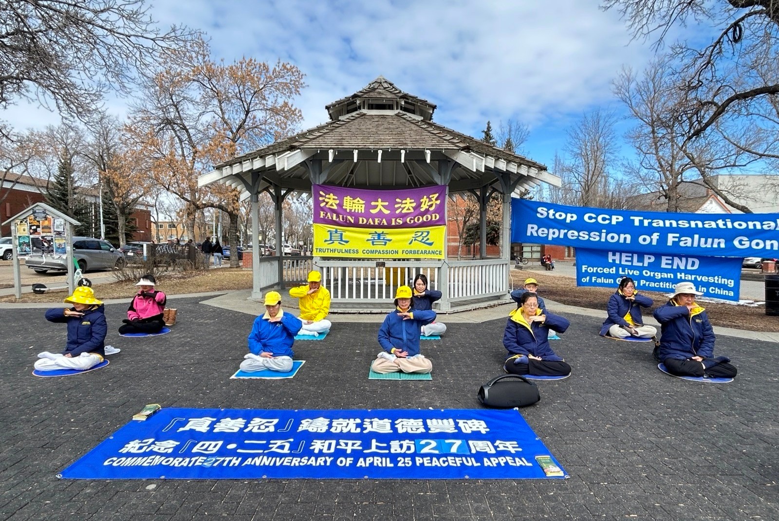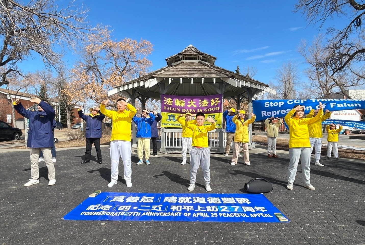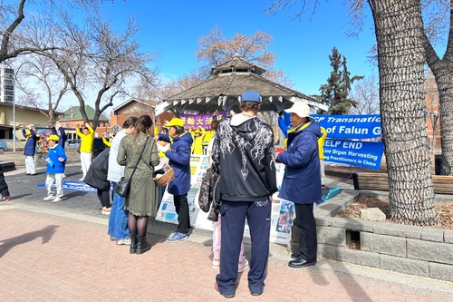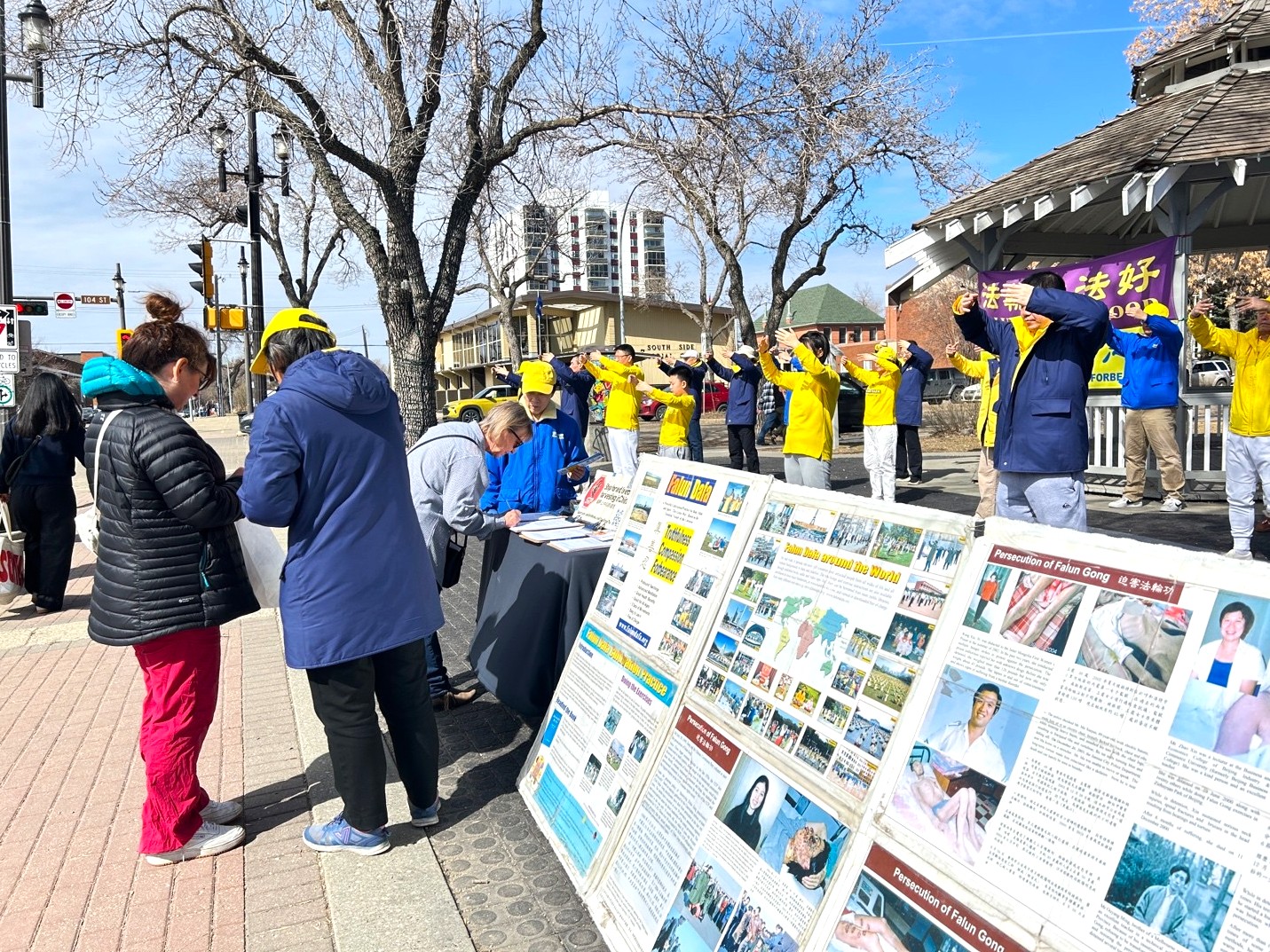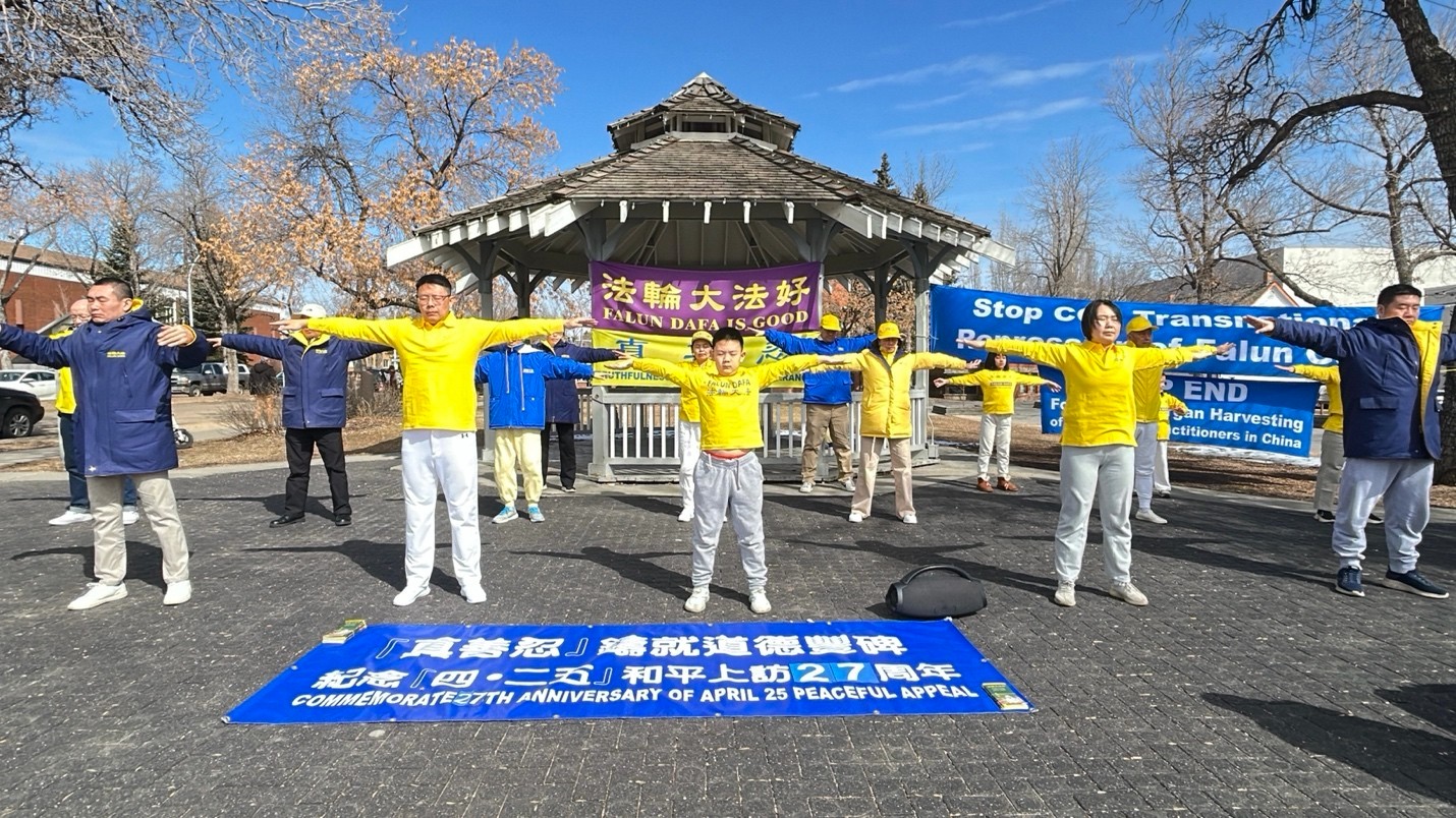 (Minghui.org) Falun Dafa practitioners held a rally at the Dr. Wilbert Mcintyre Park in downtown Edmonton on April 17, 2026, to mark the 27th anniversary of April 25 appeal in Beijing. They did the Falun Dafa exercises together, collected signatures on a petition, and raised awareness of the Chinese Communist Party’s (CCP) persecution and its transnational repression.