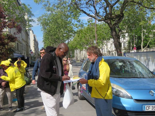 Many people stopped to watch practitioners as they demonstrated the exercises near the metro entrance. Practitioners told them about the significance of the April 25 Appeal. People expressed their support and good wishes, and signed a petition to call for an end to the persecution.