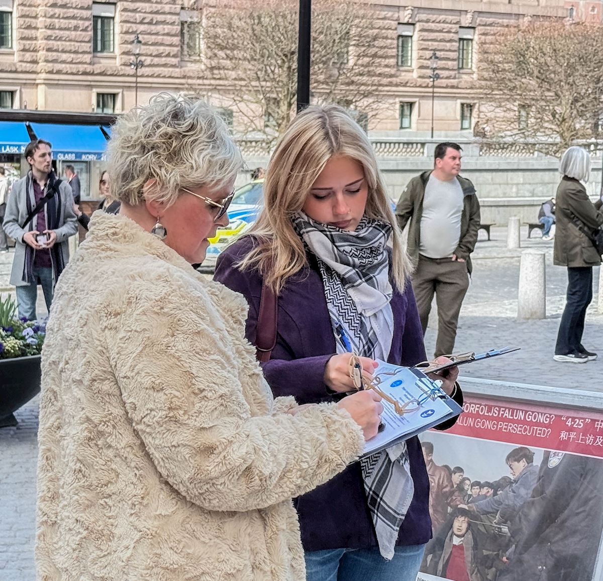 Practitioners went to Mynttorget Square beside Parliament at 1 p.m., did the exercises and collected signatures on a petition calling for an end to the persecution. They introduced the practice to the public and talked about the April 25 appeal in Beijing, the CCP’s persecution, and the CCP’s state-sanctioned forced organ harvesting.