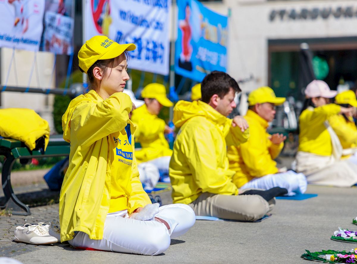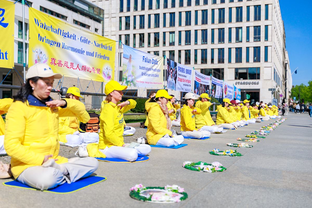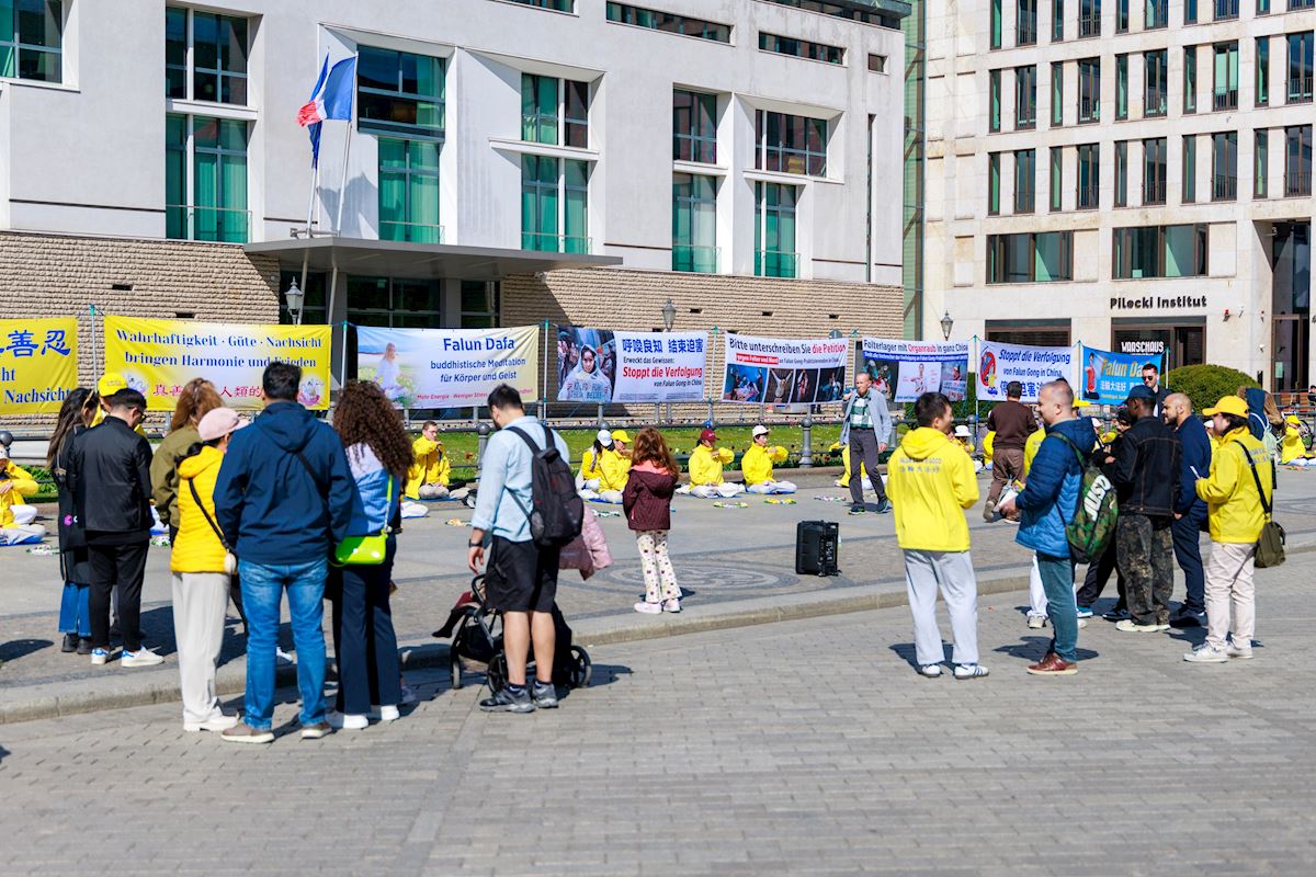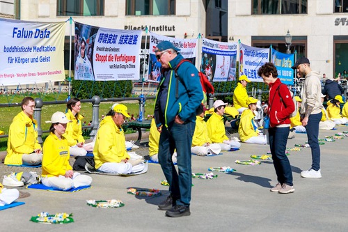 It was a sunshiny day, and people passing the Brandenburg Gate were drawn by the soothing music as practitioners demonstrated the exercises. After learning about Falun Gong and the persecution by the Chinese Communist Party (CCP), including forced organ harvesting, some passersby signed petitions that urged an end to the brutality. Some were also interested in learning the exercises.