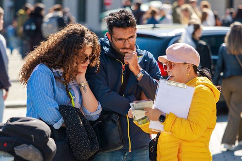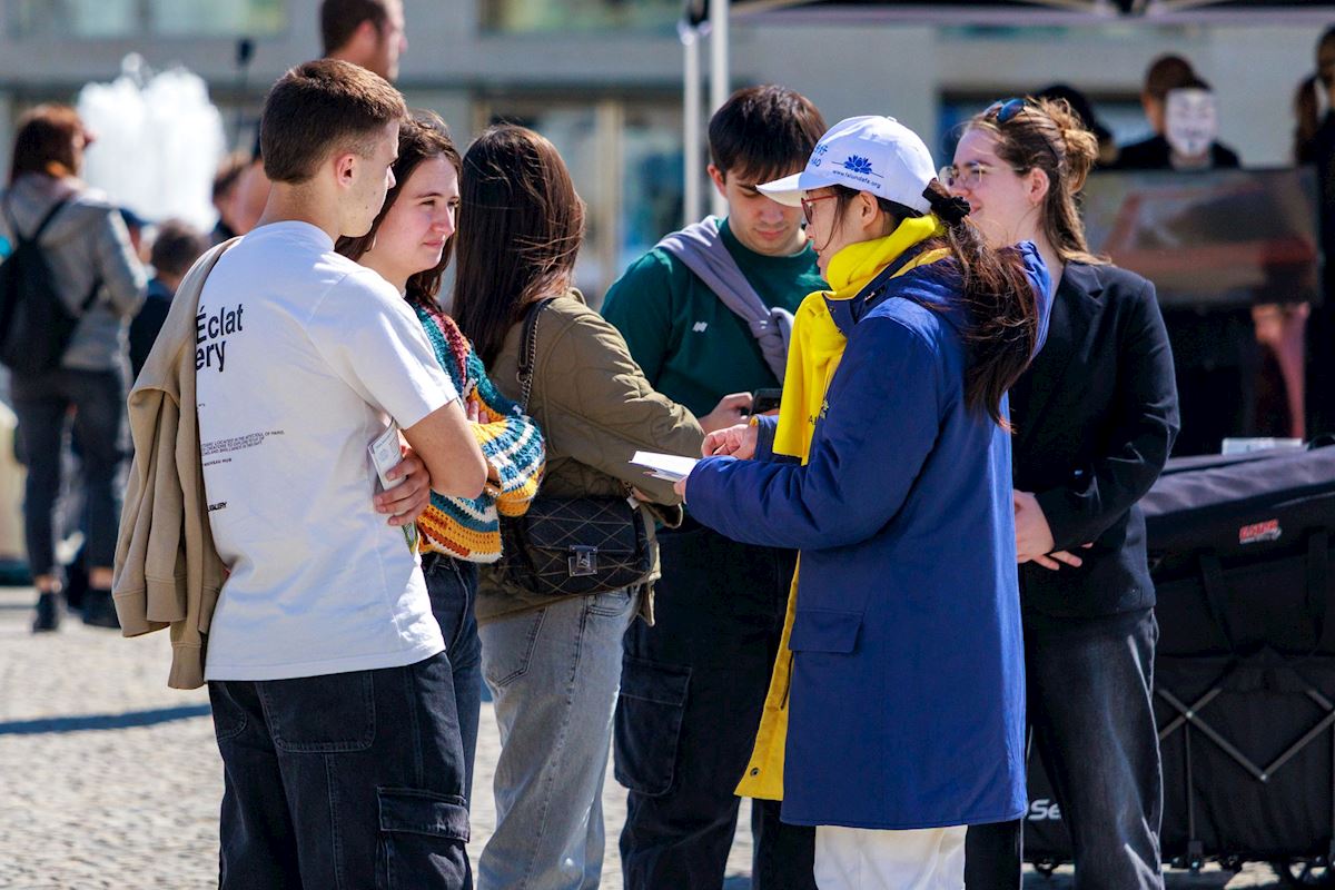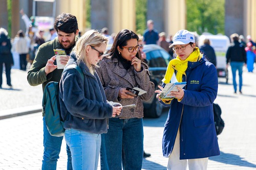 (Minghui.org) To commemorate the 27th anniversary of the April 25 appeal in Beijing in April 1999, Falun Gong practitioners in Berlin, Germany, held an event at the famous Brandenburg Gate on April 25, 2026. Passersby responded favorably.