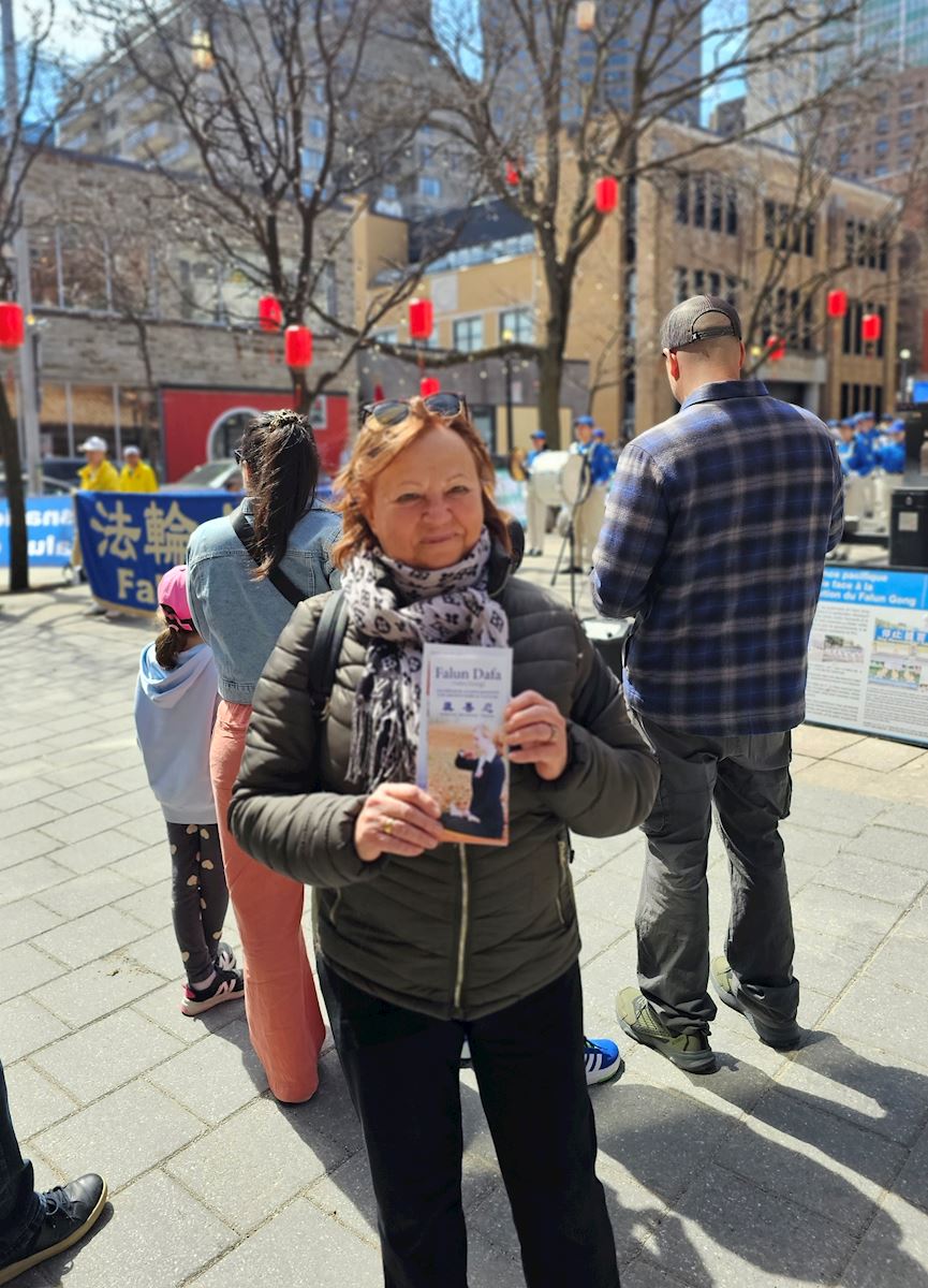 (Minghui.org) Practitioners held a rally in Montreal, Canada’s second-largest city, on April 25 to commemorate a peaceful appeal in Beijing 27 years ago and to introduce people to Falun Gong.