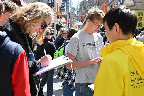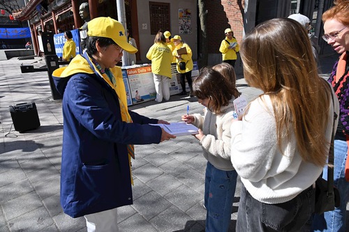 When three students (two Chinese and one Malaysian) asked what was going on, a practitioner told them the event commemorated the peaceful appeal in Beijing in April 1999. One student said, “I know about this. It was something the CCP misrepresented to defame Falun Gong.”