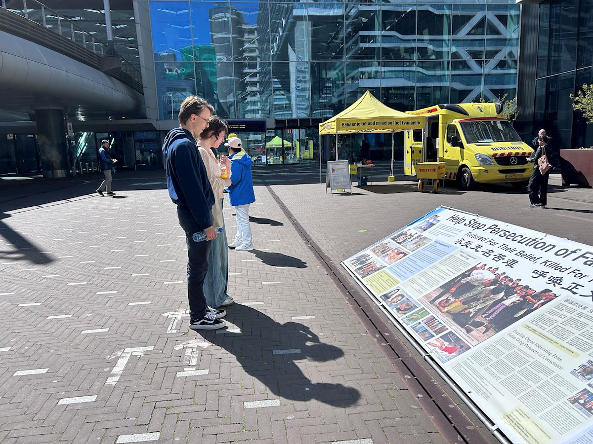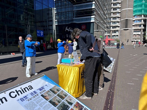 Olievier Beler, who lives in Leiden and is majoring in information studies at university, works parttime in The Hague. He said the practice was an excellent way to keep fit when he saw practitioners demonstrating the exercises. He said the CCP’s suppression was terrible. “Yet, this continues today,” he said. He was grateful to practitioners for informing him about the persecution, and he took photos of the display boards. He said he wanted to help practitioners spread the message and get more people to pay attention to the human rights abuses.