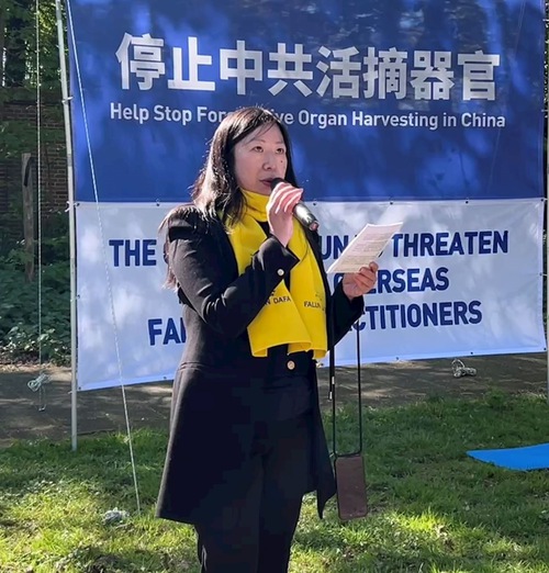 She called on officials in the Chinese government not to follow the regime by persecuting Falun Gong, to stop the state-sanctioned forced organ harvesting, and to stop the transnational repression.