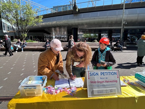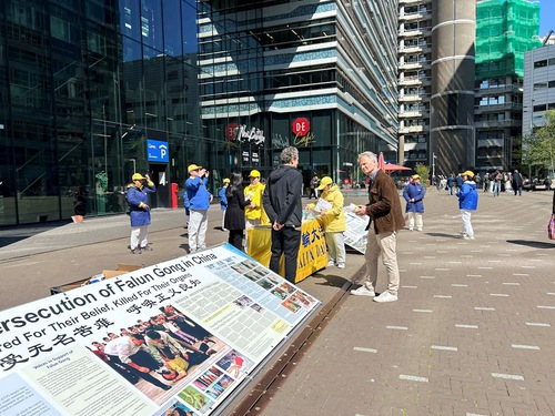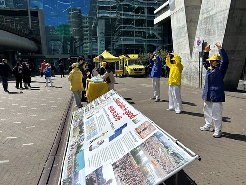 In the afternoon on April 23, practitioners set up display boards and did the exercises on Bezuidenhoutseweg near the temporary offices of the House of Representatives and Den Haag Centeraal Station to inform people of the ongoing persecution in China.