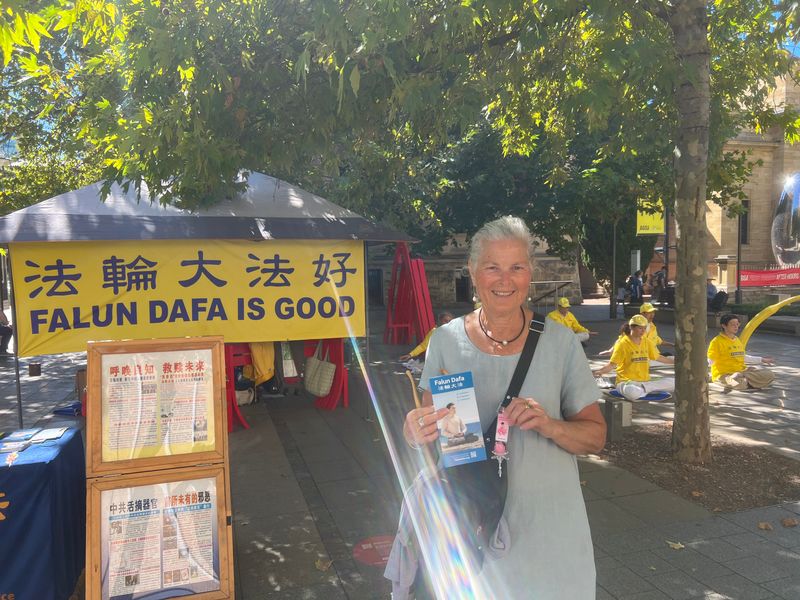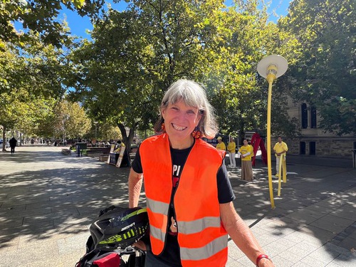 (Minghui.org) Adelaide City Councilor Jane Bange was cycling in the city over the weekend when she ran into Falun Gong practitioners’ activities to commemorate the April 25 appeal.