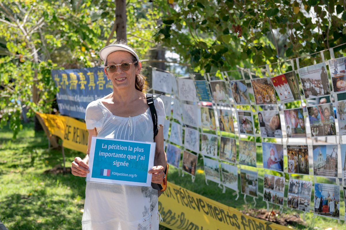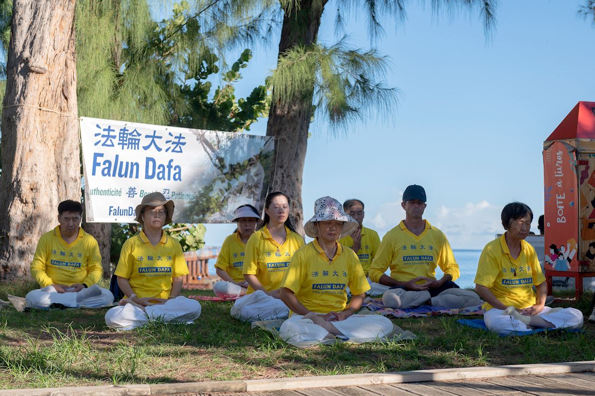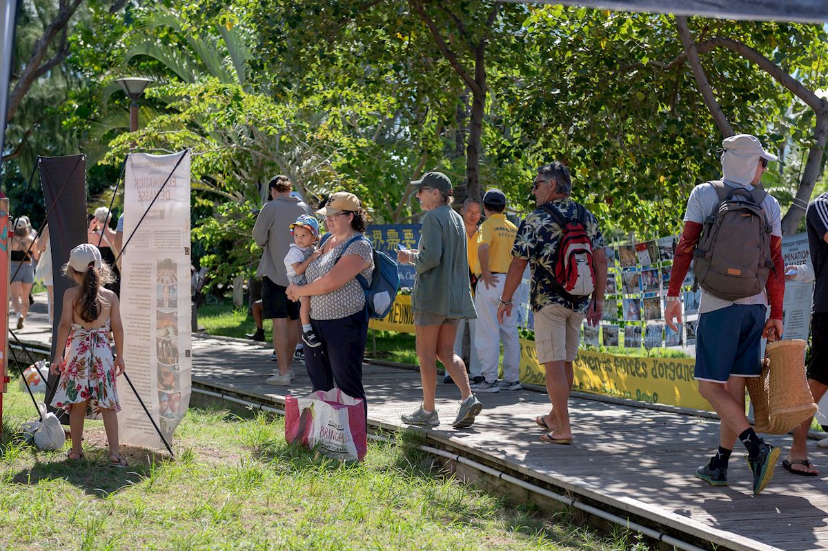 Véronique Hoarau was about to visit a nearby market but stopped at the practitioners’ booth and talked with them for a long time. She not only signed a petition, but said she also planned to attend a practice site near her daughter’s home and learn the exercises.